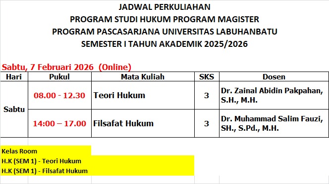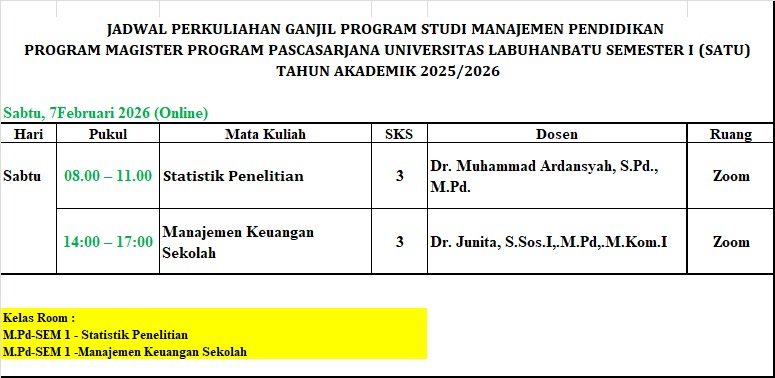 Program Pascasarjana Universitas Labuhanbatu melakukan aktifitas perkulihana seperti biasa pada hari sabtu tanggal 07 februari 2026 ada program studi Ilmu manajemen, Prodi Hukum dan Manajemen pendidikan mengadakan perkuliahan Via Zoom Meeting (online), mulainya perkuliahan ada dua sesi yaitu untuk sesi pertama di mulai jam 08.00 wib s.d 11.00 wib dan sesi kedua di mulai jam 14,00 wib s.d 17.00 wib begitu juga waktu pada setiap prodi memulai perkuliahan di jam yang sama.