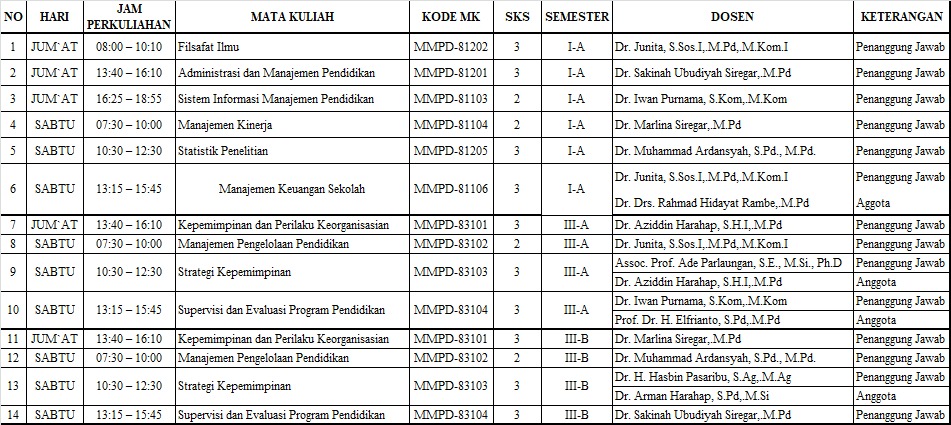 Mata Kuliah Tahun Akademik 2025/2026 pada Program Studi Manajemen Pendidikan Program Magister Program Pascasarjana Universitas Labuhanbatu
